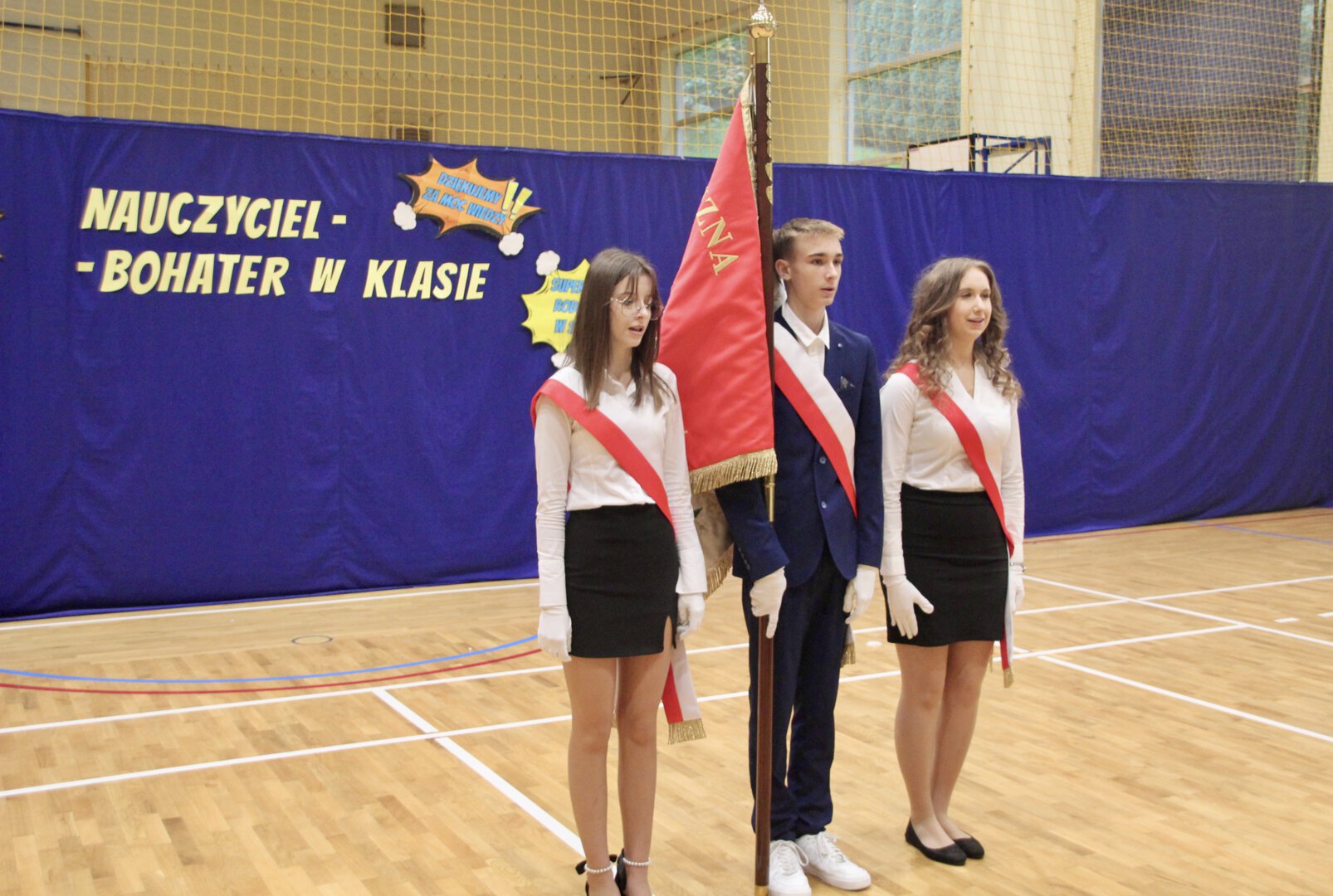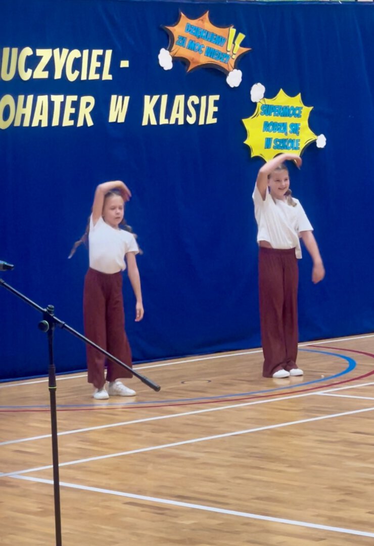 Podczas przedstawienia odwiedził nas gość z przeszłości – szlachcic, który w imieniu dawnych pokoleń złożył życzenia wszystkim pedagogom. Młodzi aktorzy w humorystyczny sposób zaprezentowali sylwetki nauczycieli, wywołując na twarzach publiczności wiele śmiechu. Nie zabrakło również występów tanecznych – uczennice pokazały, że potrafią nie tylko recytować i śpiewać, ale też tańczyć z energią! A na zakończenie dzieci wspólnie zaśpiewały „Sto lat” dla wszystkich nauczycieli.