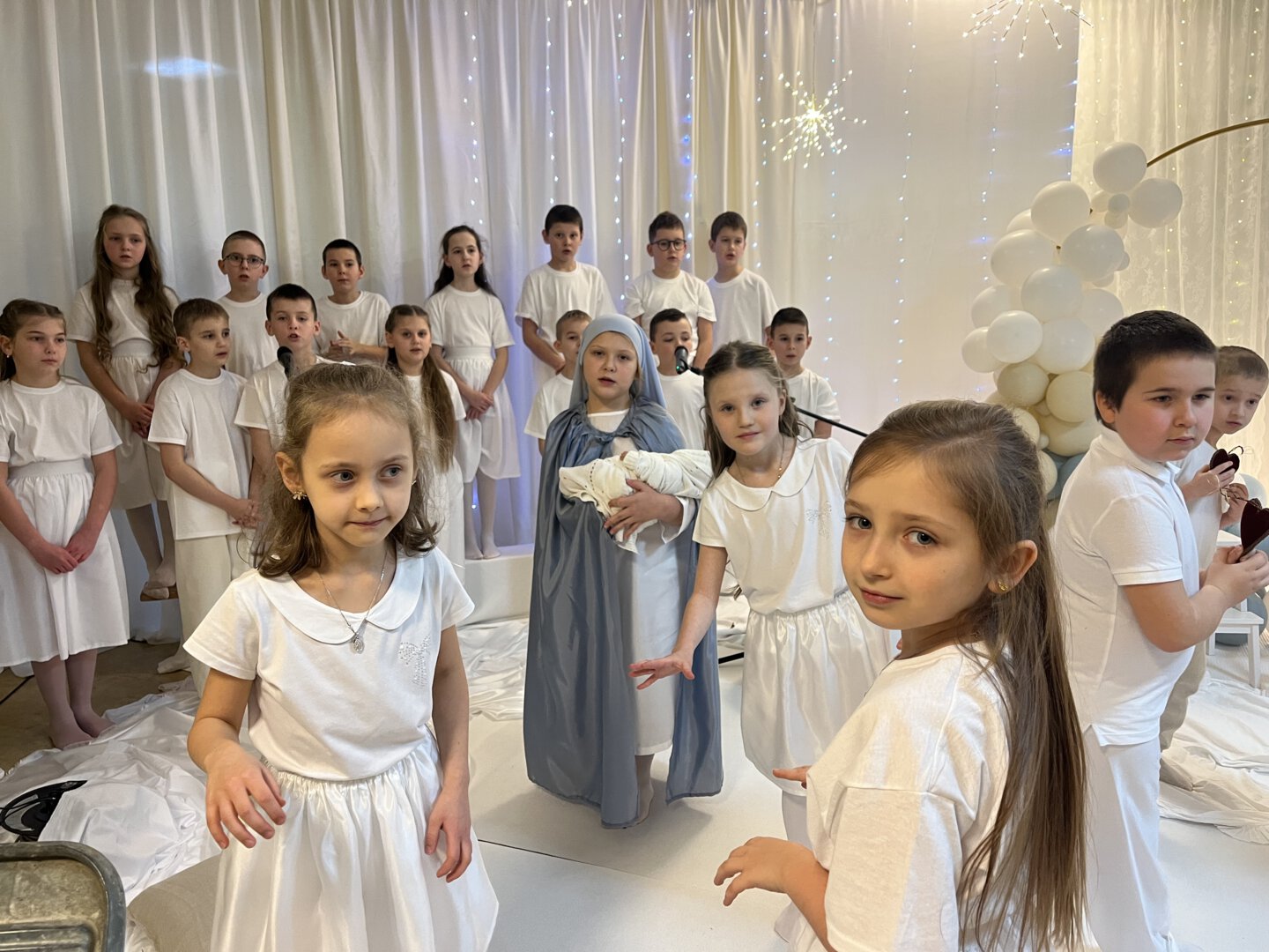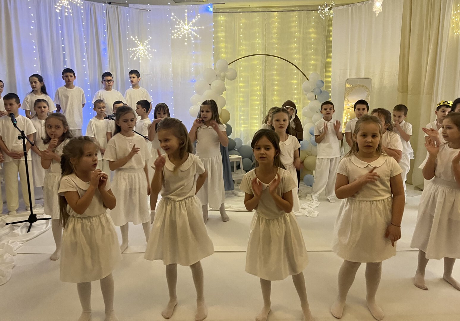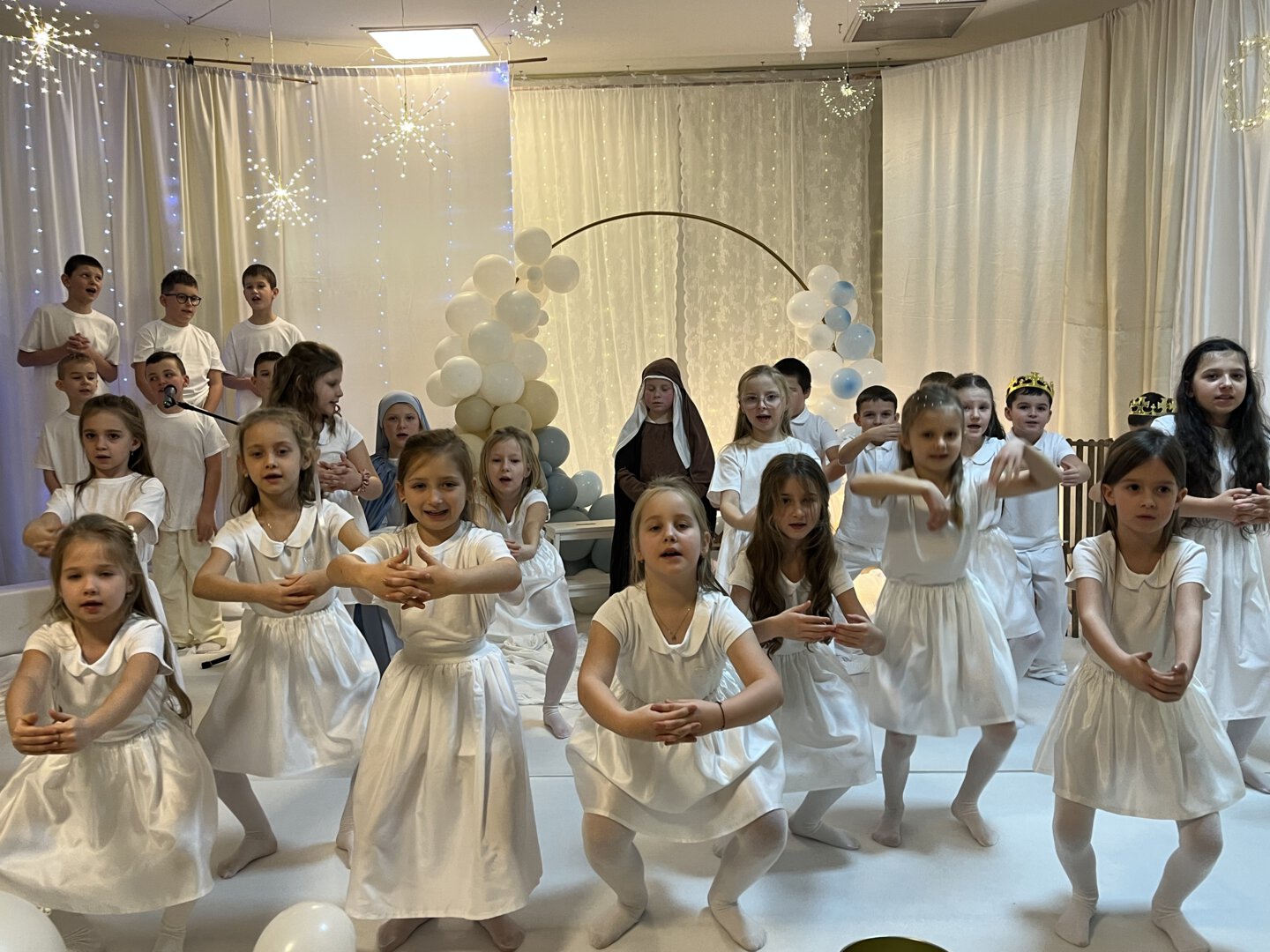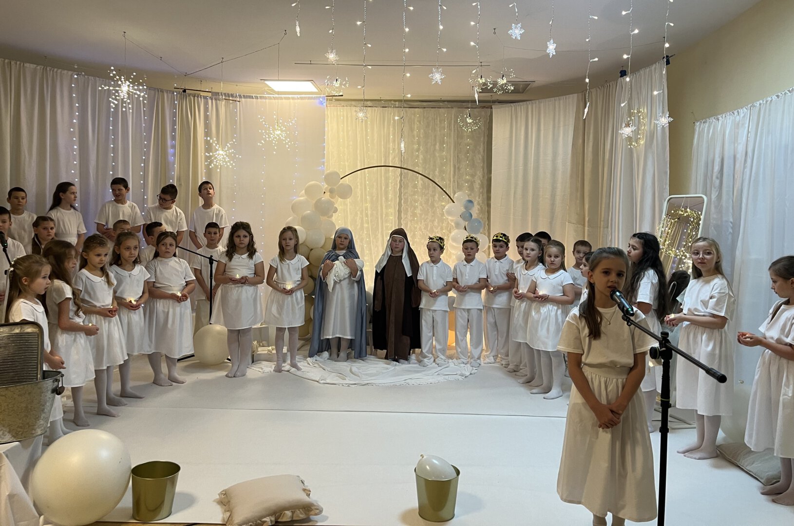 Oprawę artystyczną przygotowały Panie Anna Potyrała i Marzena Krzak dbając o każdy detal występu. Młodzi artyści z klasy 1b i 3a zaprezentowali niezwykłe przedstawienie w „Aniołkowie”, które zachwyciło wszystkich uczestników spotkania.