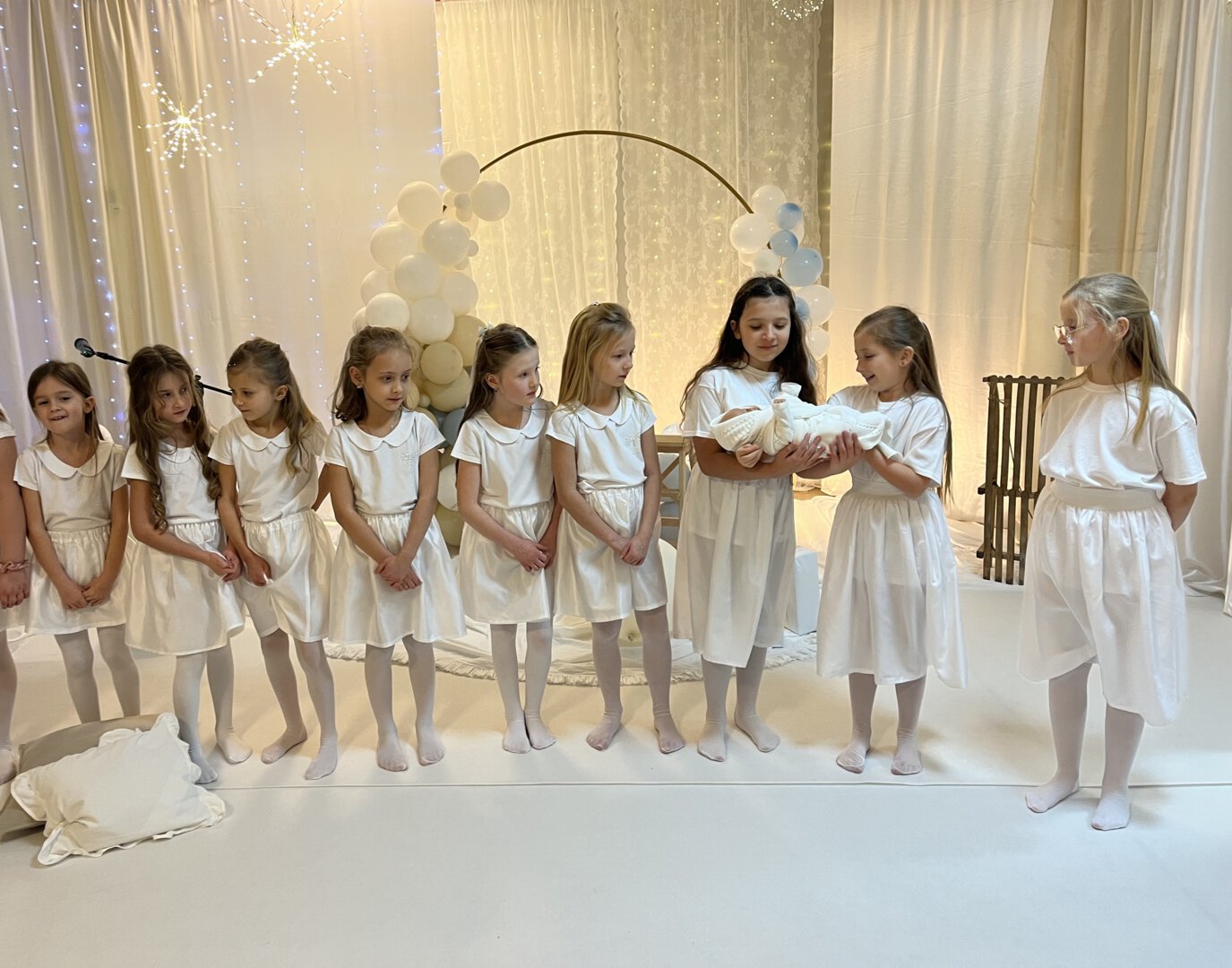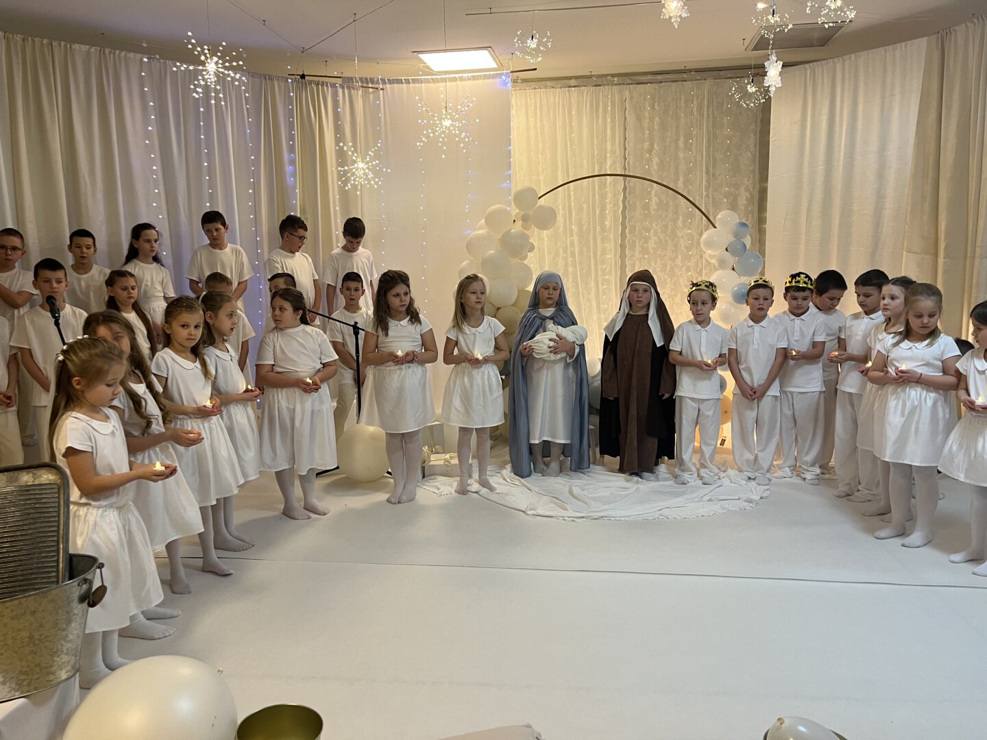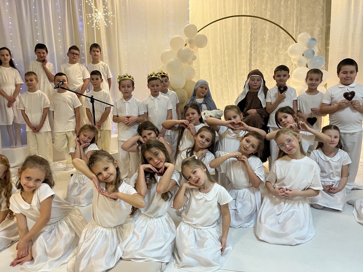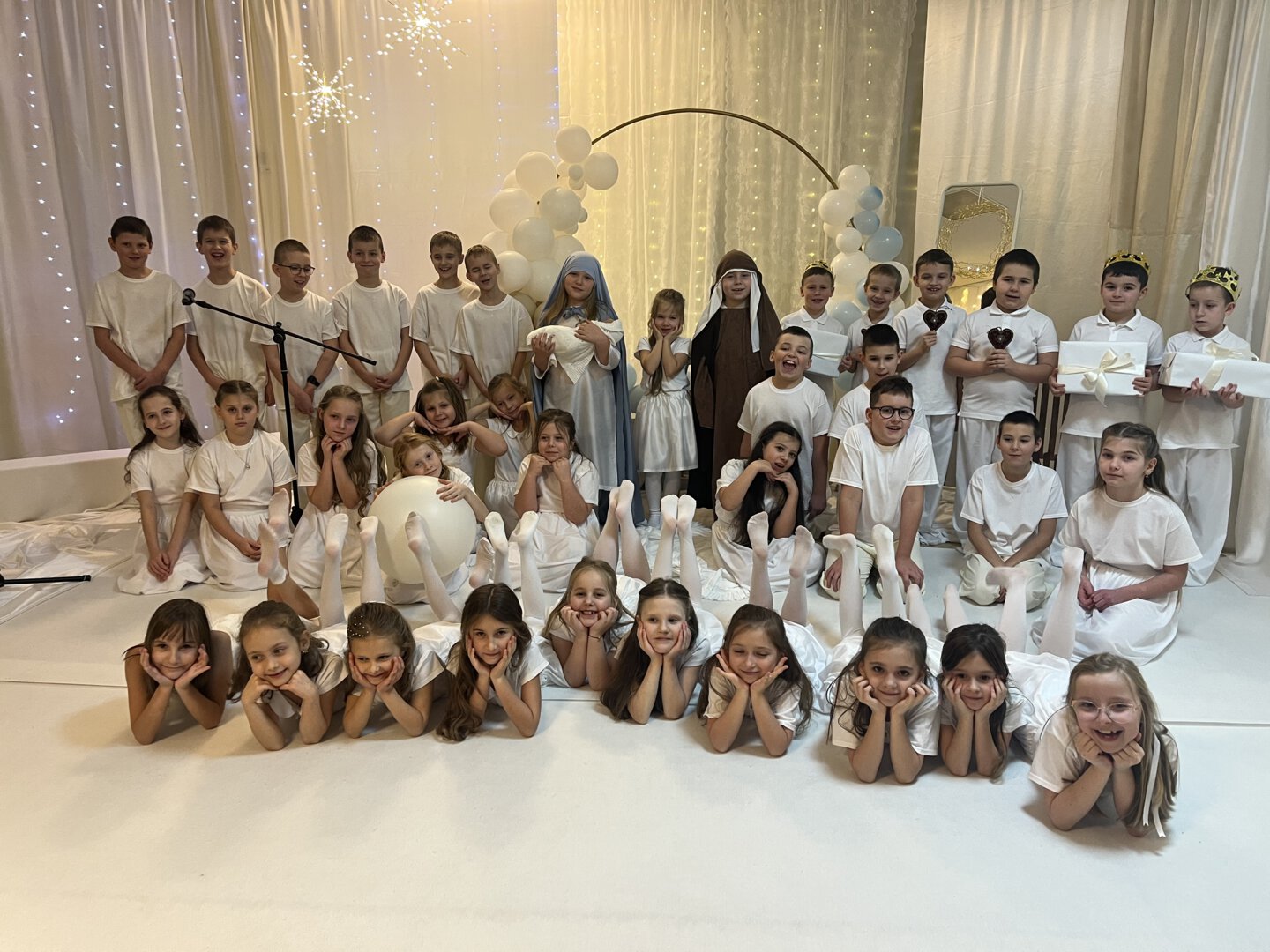 Oprawę artystyczną przygotowały Panie Anna Potyrała i Marzena Krzak dbając o każdy detal występu. Młodzi artyści z klasy 1b i 3a zaprezentowali niezwykłe przedstawienie w „Aniołkowie”, które zachwyciło wszystkich uczestników spotkania.